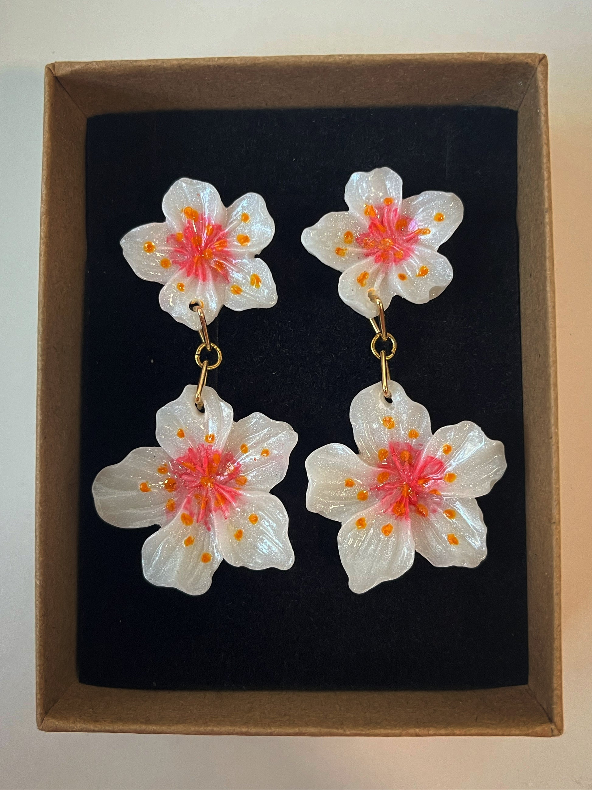 Sakura, flor del cerezo y los pendientes más finos de la colección. Cada flor es pintada a mano una a una con mucho detalle, obteniendo unos pendientes elegantes e únicos.